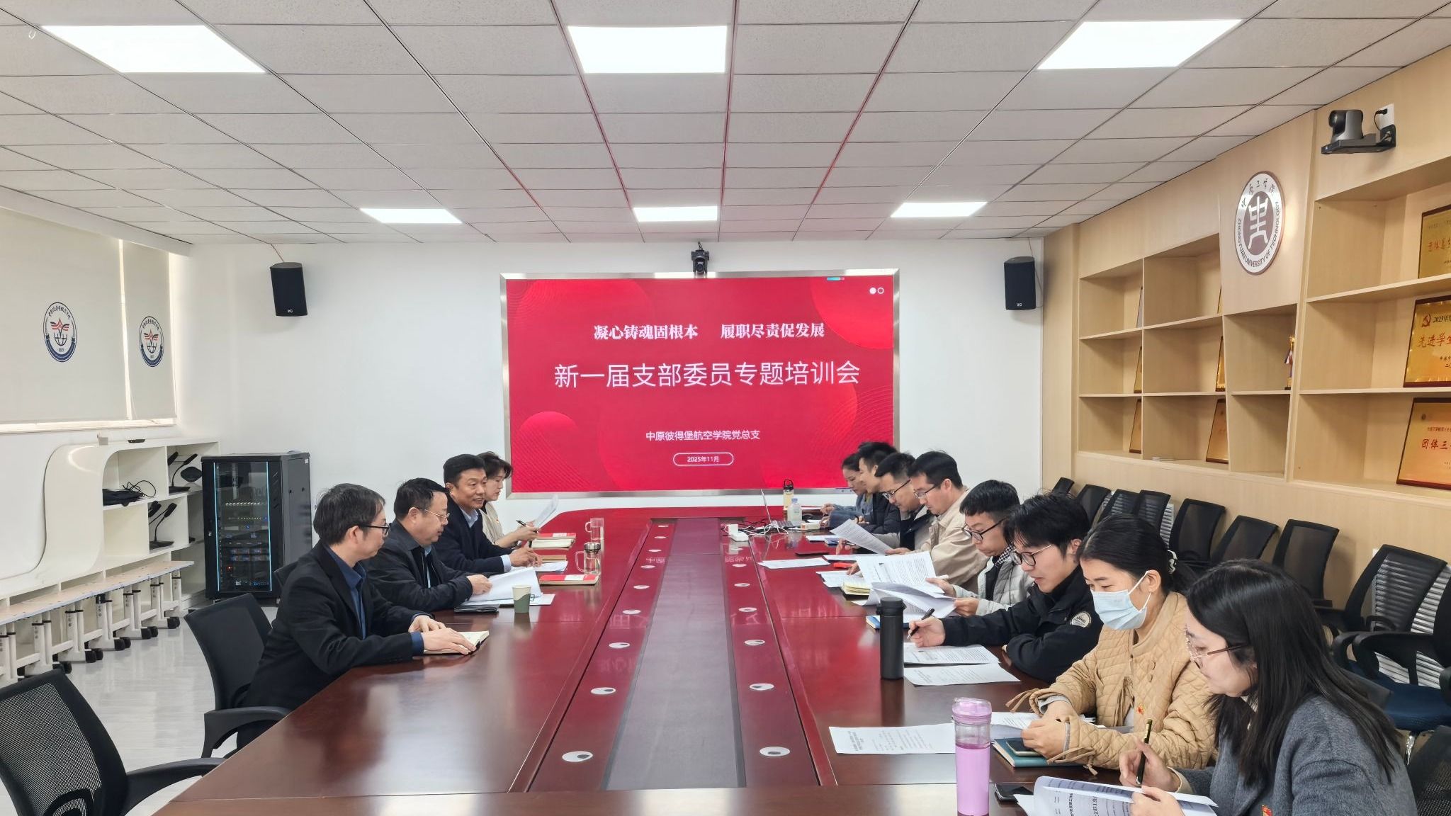 2025年10月中原彼得堡航空学院党支部完成支委换届,为提升新任支委党务工作能力,11月21日下午,学院党总支在11号楼216会议室开展支部建设交流活动。联系副校长付主木、党总支委员和支部委员参会,会议由党总支书记轩信飞主持。